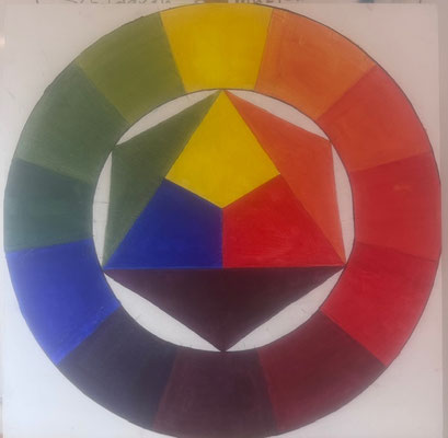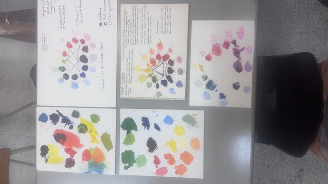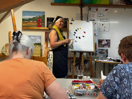 Met een praktische hands-on konden we direct meedoen met het mengen van kleuren en ervaren hoe kleuren tot stand komen en zich steeds opnieuw weer kunnen laten mengen tot steeds weer nieuwe tinten. En door de kleur met wit te vermengen kunnen ook pasteltinten worden verkregen.